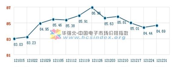 本期數碼產品價格指數結束連續兩周的回落,收報84.69點,漲0.25點,漲幅0.3%。旗下產品網絡攝像機、攝像頭、數碼相機、車載GPS、MP3和移動存儲設備價格指數上漲,漲幅分別為7.35%、2.46%、0.92%、0.86%、0.57%和0.35%。數碼攝像機和MP4價格指數下跌,跌幅分別是1.55%和0.14%。