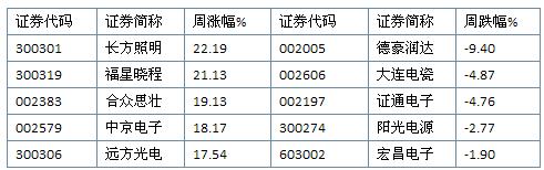 在電子行業核心企業內,長方照明以22.19%的周漲幅位居第一,德豪潤達下跌9.40%,位列跌幅榜首位: