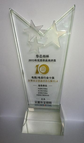 "華芯邦"杯-2013年優質供應商十強選拔經過二個月的激烈競爭,終于華麗落幕,宗盛源科技憑借優質的產品、周到的服務、低廉的價格榮獲"華芯邦"杯-2013年優質供應商十強!