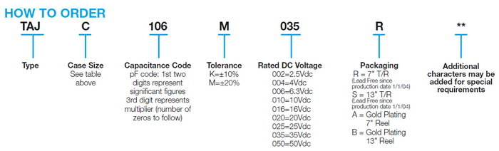 每個品牌都有自己獨立的物料編碼系統,物料編碼的內容可以準確的體現出產品的信息,想要知道品牌物料的具體參數就必須了解每個編碼所表示的意思,現在我們就以AVX鉭電容為例子為大家講解下物料編碼所表達的含義。我們以AVX鉭電容下面的 TAJB106K020RNJ 型號為例子: