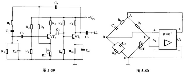 1.RC橋式振蕩器又稱為文氏電橋振蕩器,電路圖如圖5-59所示。VT1、VT2組成兩級阻容耦合放大器。R1、C1串聯以及R2、C2并聯共同組成正反饋網絡,用以選頻和產生振蕩。R5和RT組成負反饋網絡,用以改善輸出波形。R3、R4和R7、R8分別是VT1、VT2的基極偏置電阻。C7是振蕩電壓輸出耦合電容。