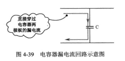 根據電容器的結構可知,電容器兩極極板之間是高度絕緣的,理想情況下不能通過電流。但是,任何絕緣體都不是理想的絕緣體,或多或少地存在著電阻,兩極之間總會有電荷穿過絕緣物質,只不過數量很少而已,這樣電容器兩端加上電壓后就會有電流流過電容器的兩根引腳,稱為電容器的漏電流,如圖4-39所示是電容器漏電流回路示意圖。