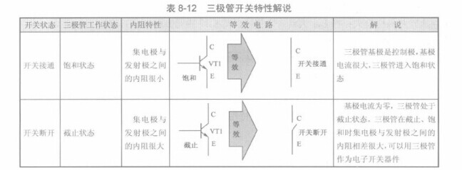 三極管同二極管一樣,也可以作為電子開(kāi)關(guān)器件,構(gòu)成電子開(kāi)關(guān)電路。當(dāng)三極管用于開(kāi)關(guān)電路中時(shí),三極管工作在截止、飽和兩個(gè)狀態(tài),詳細(xì)情況如表8-12所示。