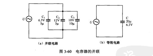 電容器并聯后的總容量增大,總容量等于所有并聯電容器的容量之和,以圖3-60(a)所示電路為例,并聯后總容量為