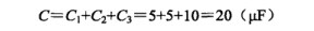 電容器并聯后的總耐壓以耐壓最小的電容器的耐壓為準,仍以圖3-60(a)所示電路為例,C1、C2、C3耐壓不同,其中C1的耐壓最小,故并聯后電容器的總耐壓以C1耐壓6.3V為準,加在并聯電容器兩端的電壓不能超過6.3V。